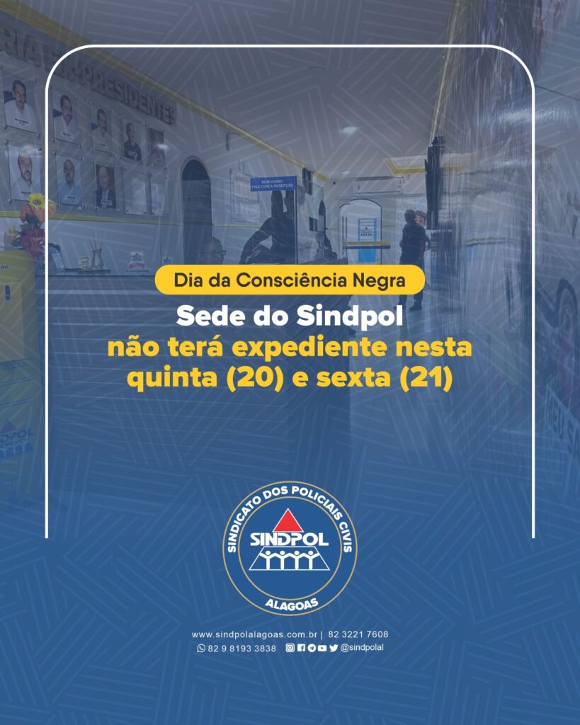 O Sindicato dos Policiais Civis de Alagoas (Sindpol) informa que, devido ao feriado do Dia da Consciência Negra e ao decreto de ponto facultativo emitido pelo Governo de Alagoas, não haverá expediente na sede do Sindicato nesta quinta-feira (20) e sexta-feira (21).