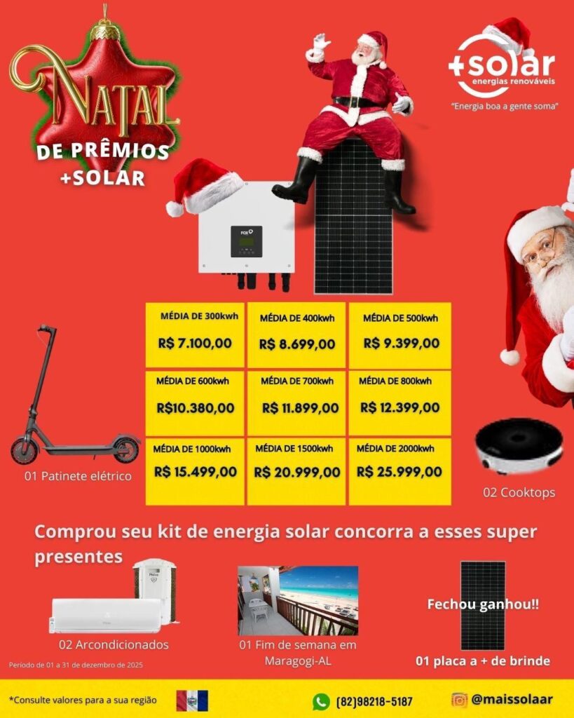 O convênio entre o Sindicato dos Policiais Civis de Alagoas (Sindpol) e a +Solar Energias Renováveis garante vantagens exclusivas neste mês de dezembro. Na compra de um kit de placas solares, o sindicalizado concorre a: Patinete elétrico; Ar-condicionado; Final de semana em Maragogi; Cooktop e ainda ganha 1 placa solar de brinde!