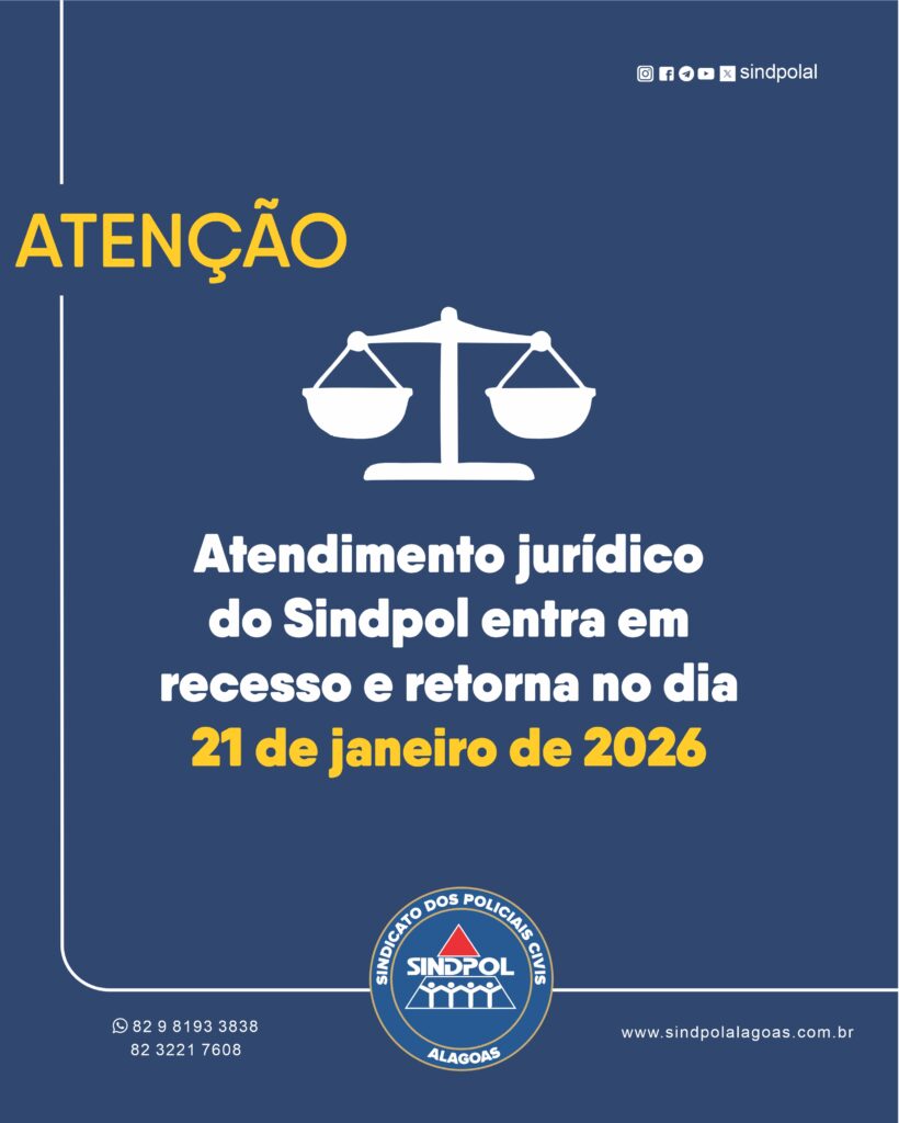 Em virtude do recesso do Judiciário, o corpo jurídico do Sindicato dos Policiais Civis de Alagoas (Sindpol) informa que o atendimento será retomado no dia 21 de janeiro de 2026.