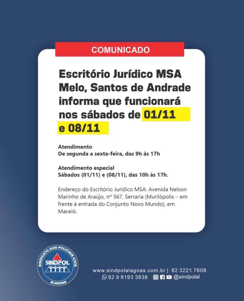 O Escritório Jurídico MSA – Melo, Santos de Andrade informa que fará atendimento especial aos sábados, nos dias 1º e 8 de novembro, das 10h às 17h.