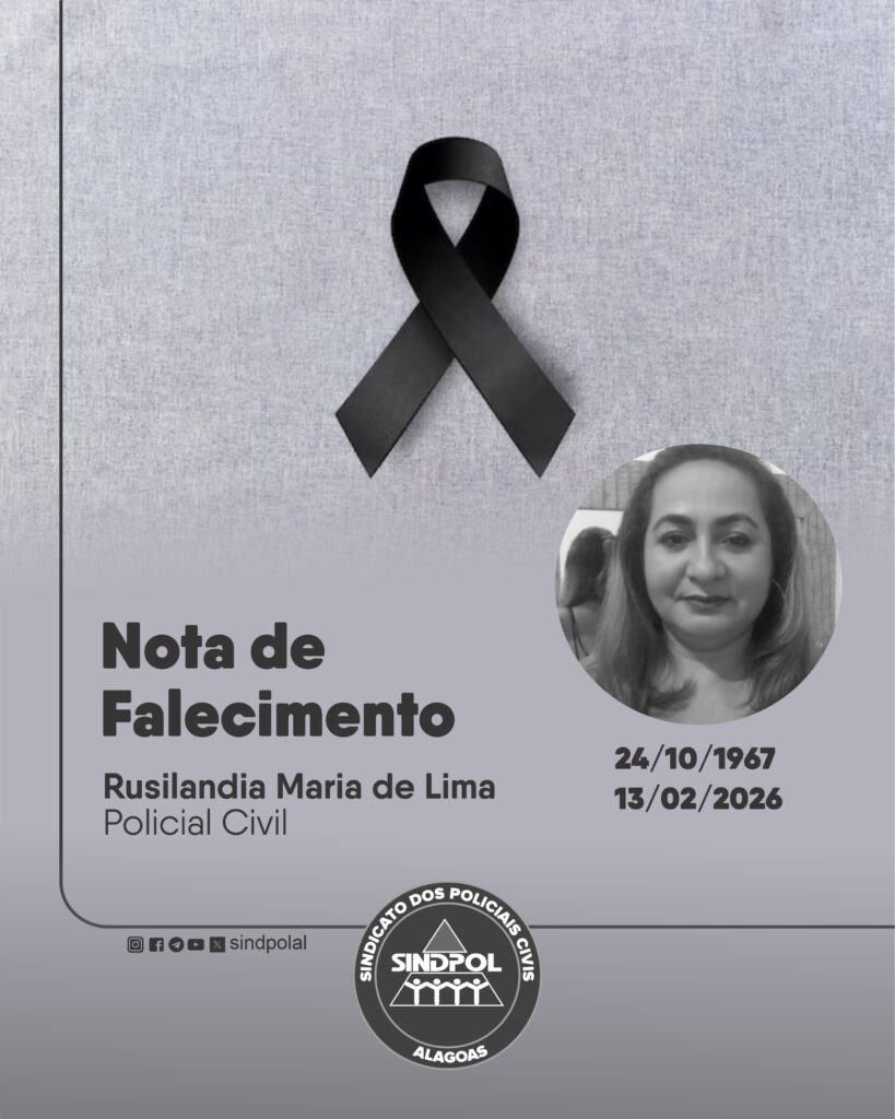 É com profundo pesar que o Sindicato dos Policiais Civis de Alagoas (Sindpol) comunica o falecimento da policial civil Rusilandia Maria de Lima, de 58 anos, ocorrido nesta sexta-feira (13/02), decorrente de morte clínica.