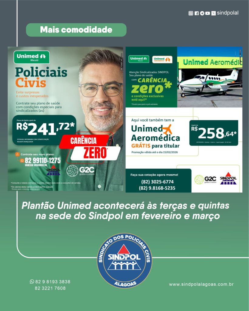 O Sindicato dos Policiais Civis de Alagoas (Sindpol) disponibilizará plantão de atendimento da Unimed duas vezes por semana, durante os meses de fevereiro e março, na sede da entidade.