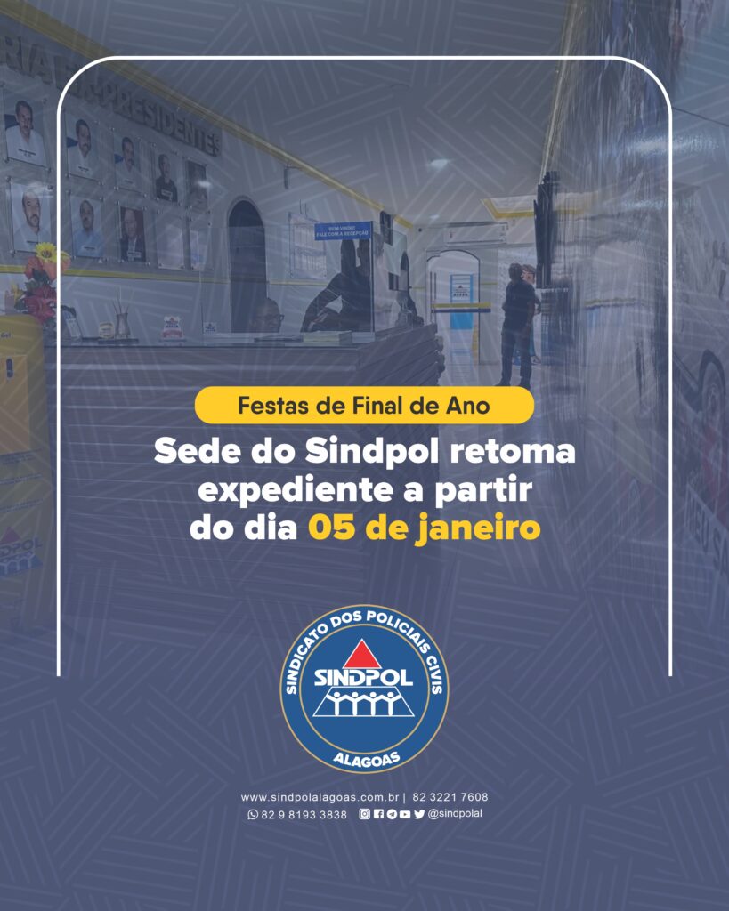 O Sindicato dos Policiais Civis de Alagoas (Sindpol) informa que, em razão das festividades de final de ano, não haverá expediente na sede do sindicato no período de 26 de dezembro a 02 de janeiro.