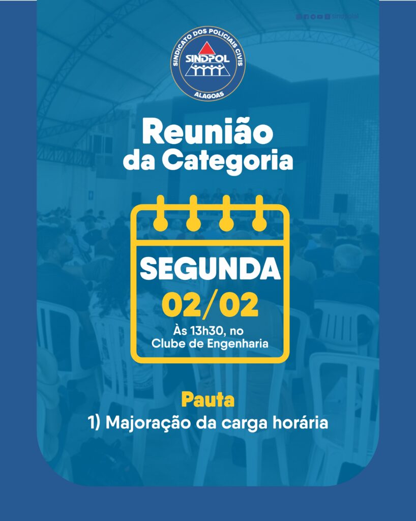 O Sindicato dos Policiais Civis do Estado de Alagoas (Sindpol/AL) convoca todos os policiais civis de Alagoas para reunião da categoria, a ser realizada no dia 02 de fevereiro de 2026, às 13h30, no Clube de Engenharia de Alagoas, localizado na Rua Capitão Samuel Lins, nº 11, bairro Farol, Maceió/AL, para tratar da seguinte pauta: majoração da carga horária.