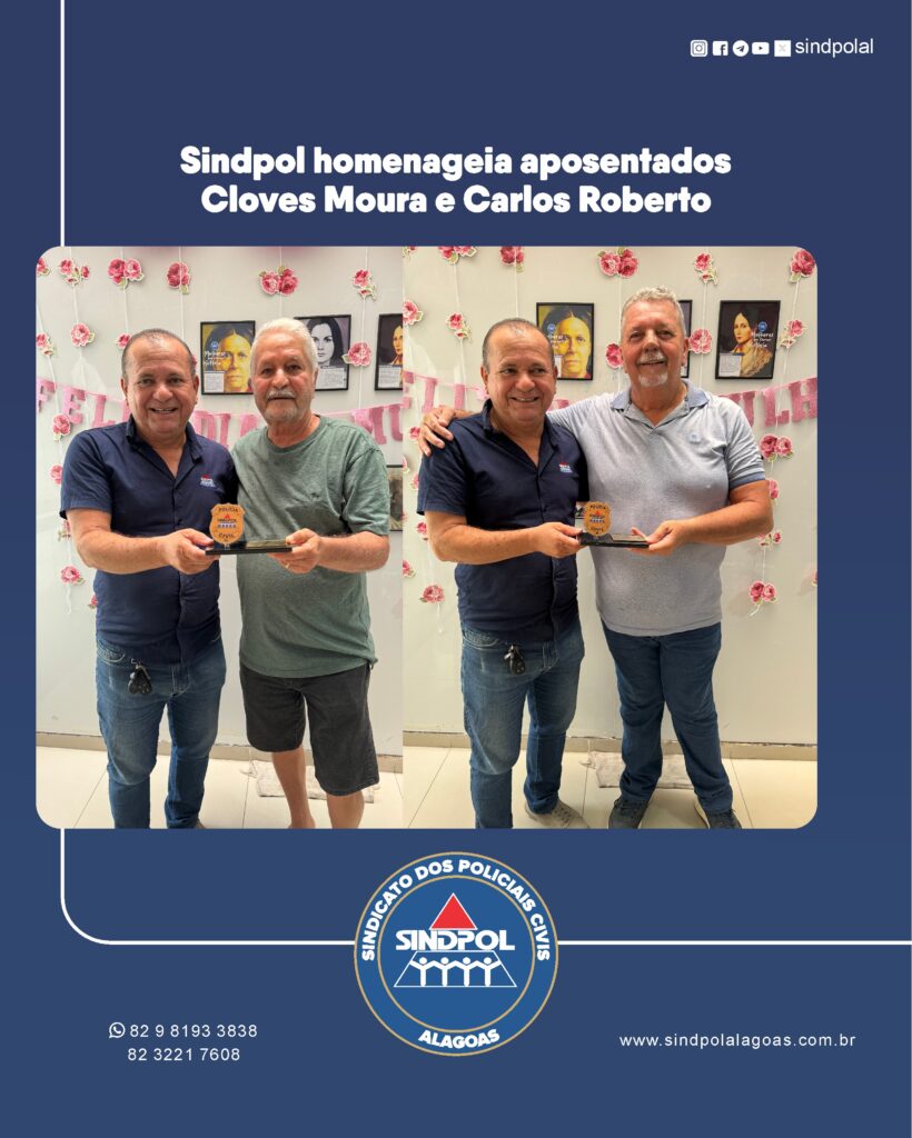 O Sindicato dos Policiais Civis de Alagoas (Sindpol) homenageou, nesta terça-feira (17), os policiai~s civis aposentados Cloves Moura e Carlos Roberto Nunes de Lima. Eles receberam um troféu em reconhecimento ao compromisso com a instituição e à contribuição nas lutas, conquistas e no fortalecimento da entidade sindical.