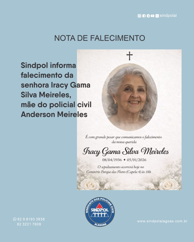 O Sindicato dos Policiais Civis de Alagoas (Sindpol) informa, com pesar, o falecimento da senhora Iracy Gama Silva Meireles, mãe do policial civil Anderson Meireles.