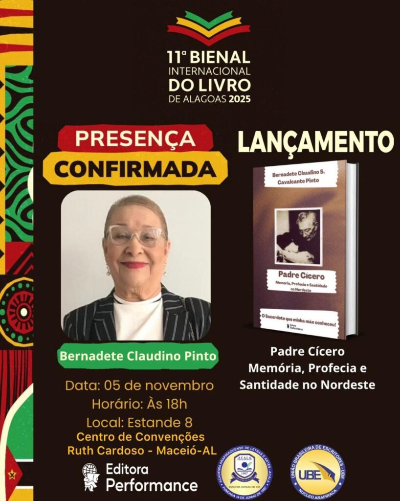 O Sindicato dos Policiais Civis de Alagoas (Sindpol) informa que a senhora Bernadete Claudino Pinto, mãe do policial civil Daniel Pinto, fará o lançamento do livro Padre Cícero: Memória, Profecia e Santidade no Nordeste durante a 11ª Bienal Internacional do Livro de Alagoas.
