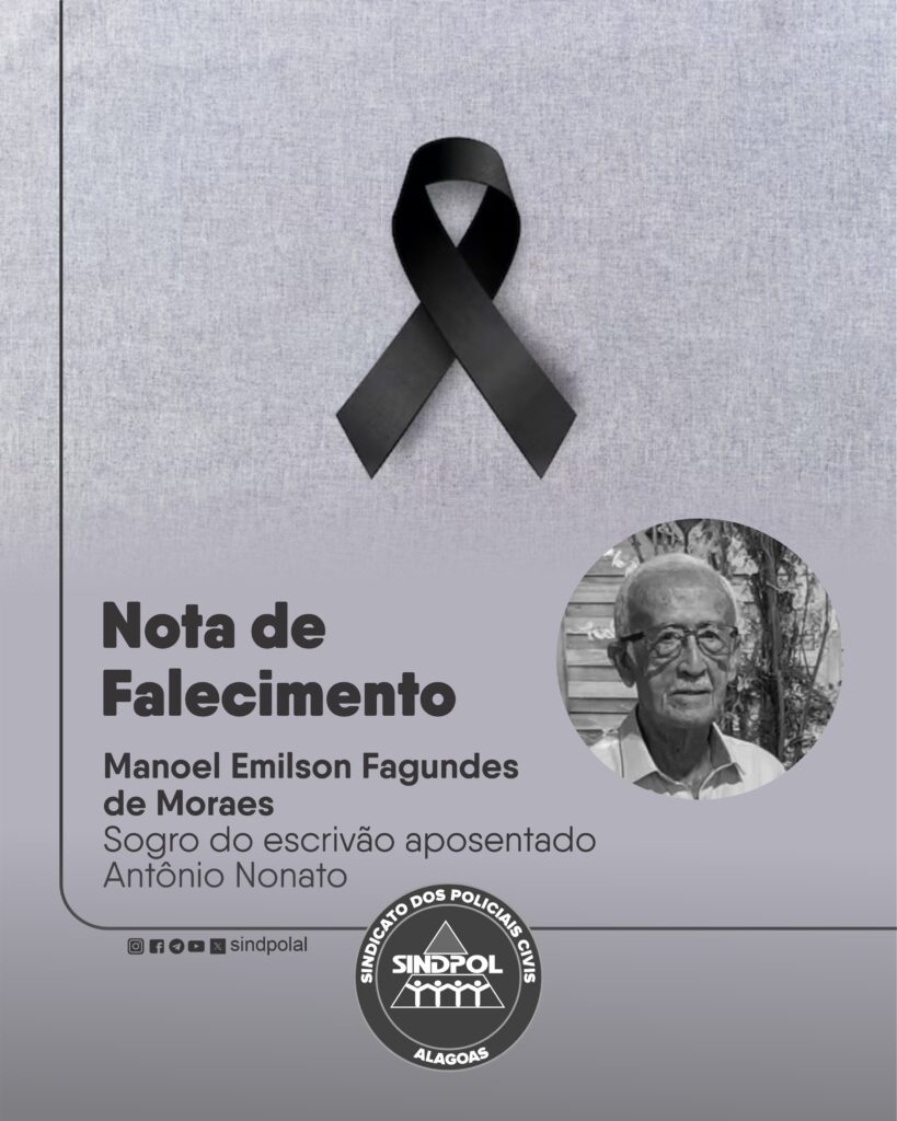 É com pesar que o Sindicato dos Policiais Civis de Alagoas (Sindpol) informa o falecimento do senhor Manoel Emilson Fagundes de Moraes, sogro do escrivão aposentado Antônio Nonato, ocorrido na quarta-feira (04).