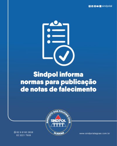 O Sindicato dos Policias Civis de Alagoas informa que, em razão do feriado do Dia do Evangélico, na segunda-feira (30), decretado pelo Governo, não haverá expediente da sede do sindicato.