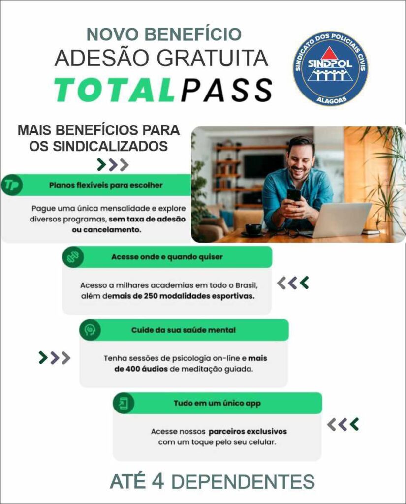 Cuidar de quem cuida da sociedade é prioridade do Sindicato dos Policiais Civis de Alagoas (Sindpol), que anuncia mais uma grande novidade para seus sindicalizados: a adesão gratuita ao TotalPass, um dos maiores aplicativos de saúde e atividade física do país. O Sindpol reforça, assim, seu compromisso com o bem-estar, a saúde e a qualidade de vida dos policiais civis.