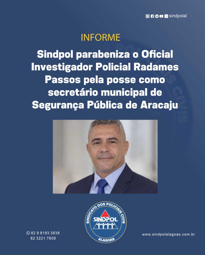 O Sindicato dos Policiais Civis de Alagoas – Sindpol parabeniza o Oficial Investigador Policial Radames Passos pela posse como secretário municipal da Segurança e Cidadania de Aracaju. A sua nomeação representa a valorização da categoria e o reconhecimento da trajetória profissional do policial civil.